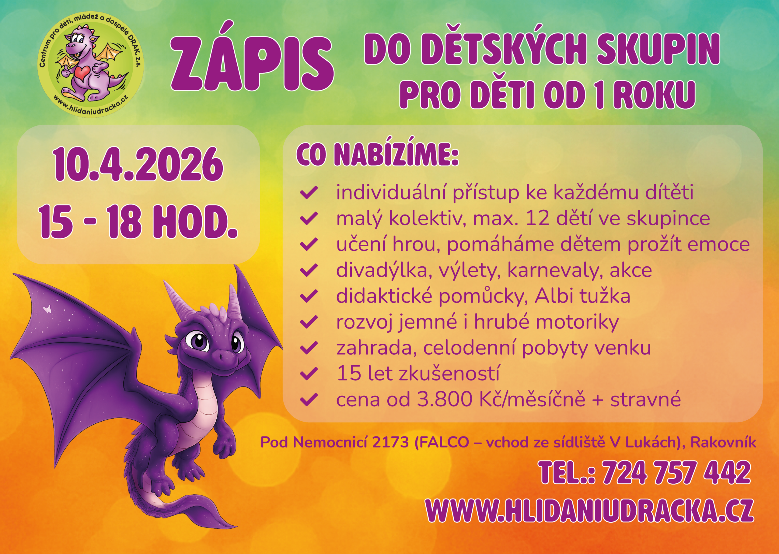Pokud máte zájem o umístění dítěte do jedné z našich dětských skupin, nejprve nás kontaktujte, abychom vám sdělili aktuální dostupnost míst, nebo přijďte 10.4.2026 k ZÁPISU DO DĚTSKÝCH SKUPIN.